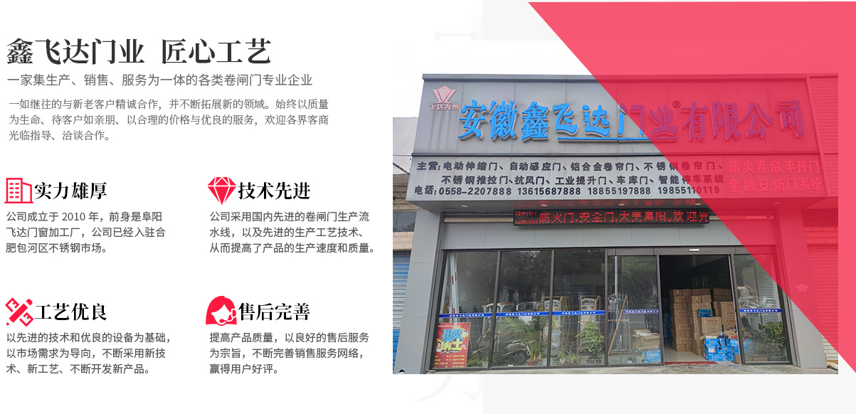- 安徽鑫飛達(dá)門業(yè)有限公司成立于1998年,前身是阜陽(yáng)飛達(dá)門窗加工廠,現(xiàn)在公司已經(jīng)入駐合肥包河區(qū)不銹鋼市場(chǎng)。本公司是一家集生產(chǎn)、銷售、服務(wù)為一體的各類卷閘門專業(yè)企業(yè)。公司采用國(guó)內(nèi)先進(jìn)的卷閘門生產(chǎn)流水線,以及先進(jìn)的生產(chǎn)工藝技術(shù)、從而提高了產(chǎn)品的生產(chǎn)速度和質(zhì)量。旗下?lián)碛酗w達(dá)九州和飛達(dá)門業(yè)兩個(gè)注冊(cè)商標(biāo)。 產(chǎn)品種類齊全 ,質(zhì)量可靠,主要有不銹鋼推拉門,防火卷簾門,電動(dòng)卷...